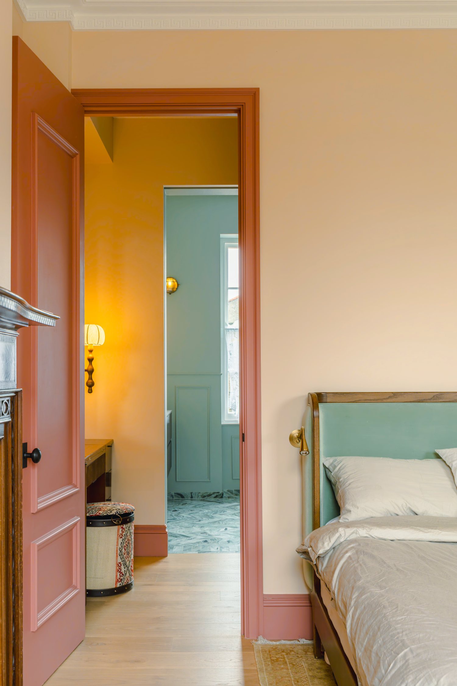 The office, for instance, is an elegant balance of green and blue tones — a space designed for creativity and tranquility. The master bedroom, painted in a sandy yellow base, is complemented by wooden elements in a warm Mediterranean terracotta — a tone inspired by family trips to Sicily. This delicate blush hue brings warmth even to the greyest London mornings. The adjoining bathroom blends muted greens, blues and greys, paired with carefully selected green tiles that add depth and sophistication.
