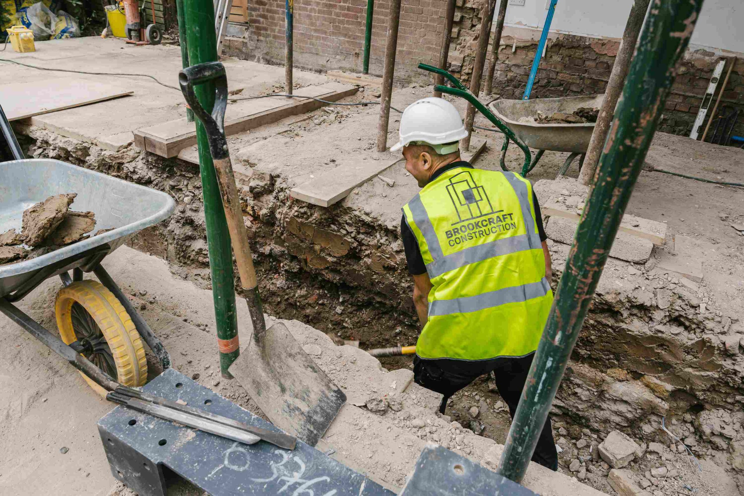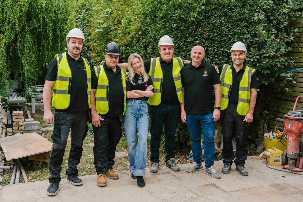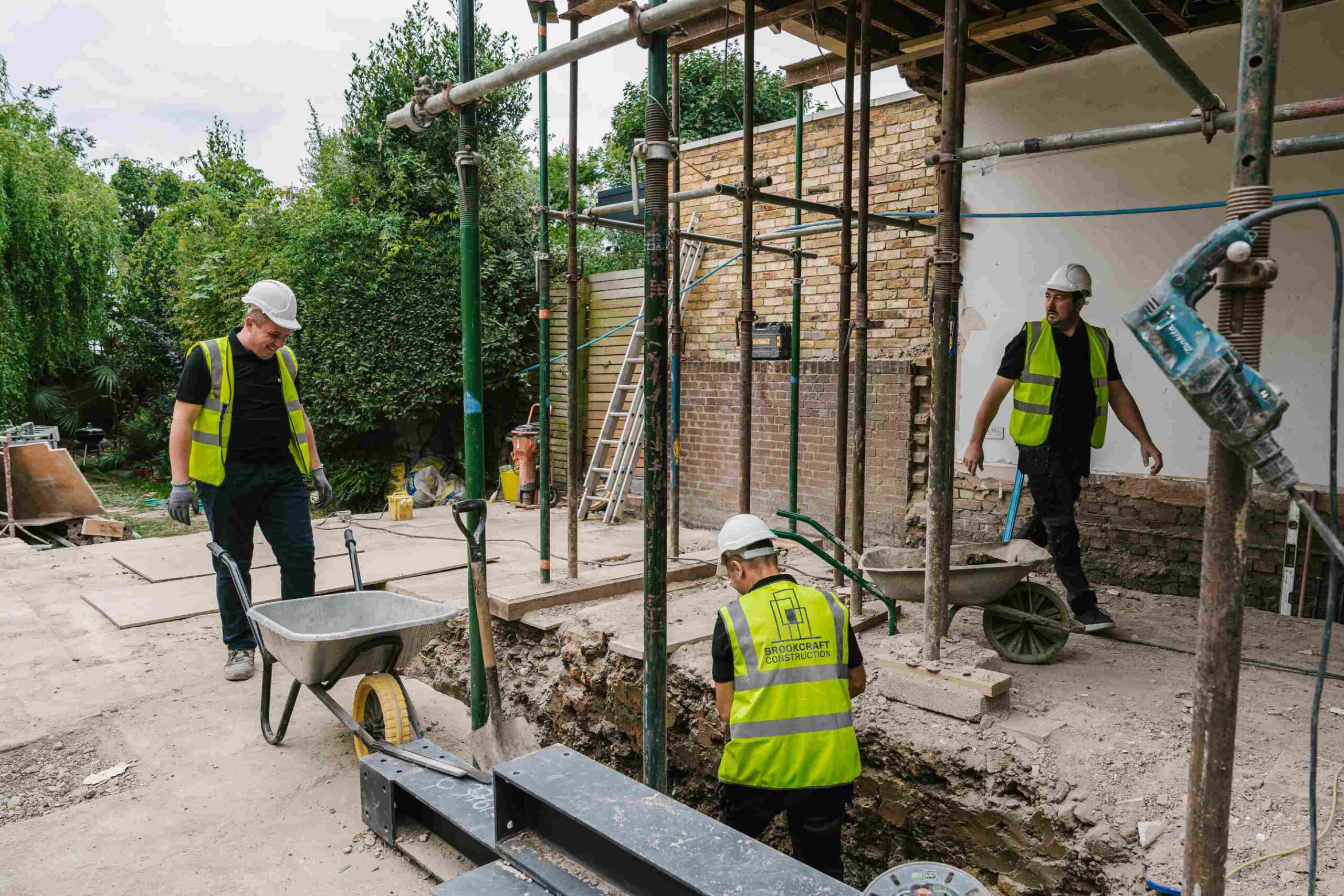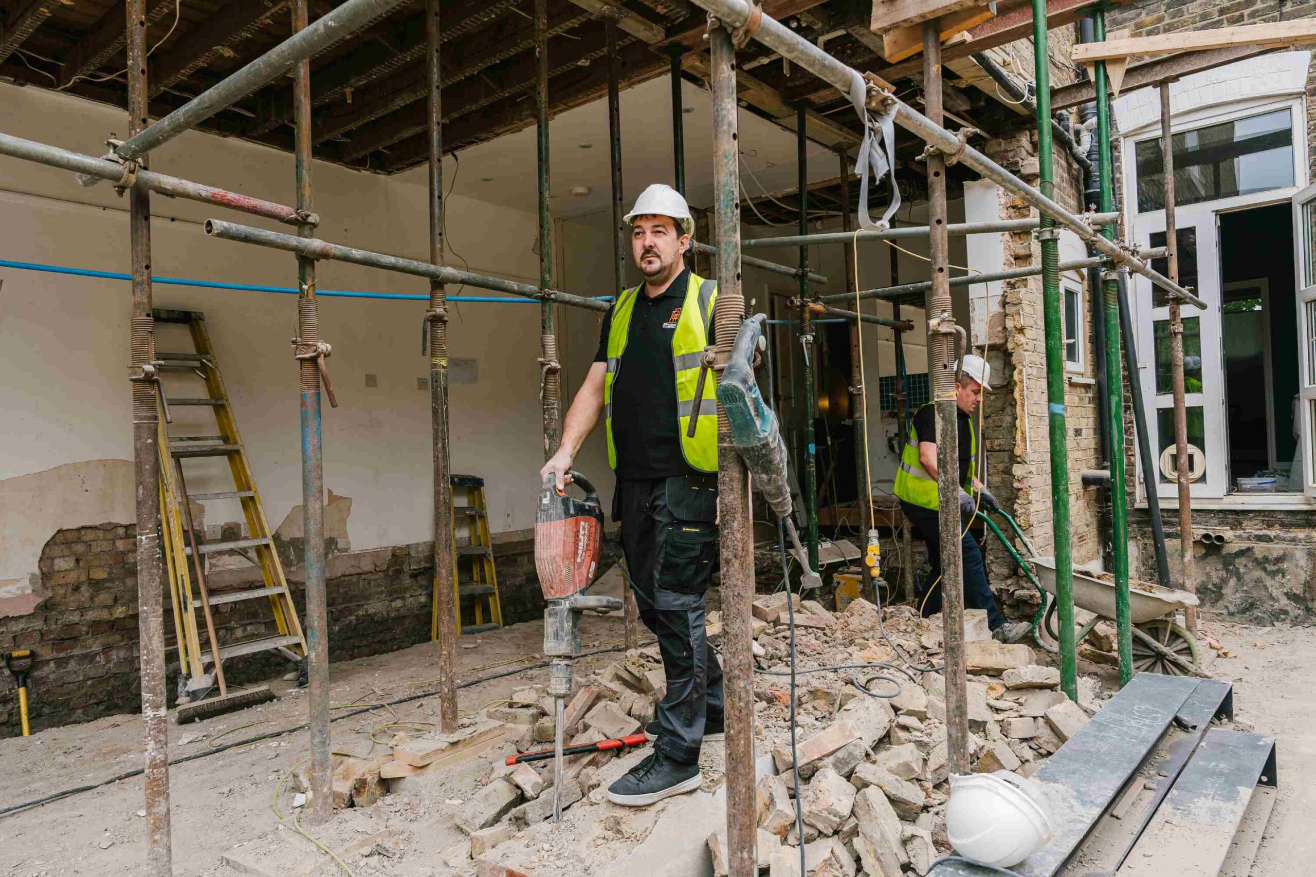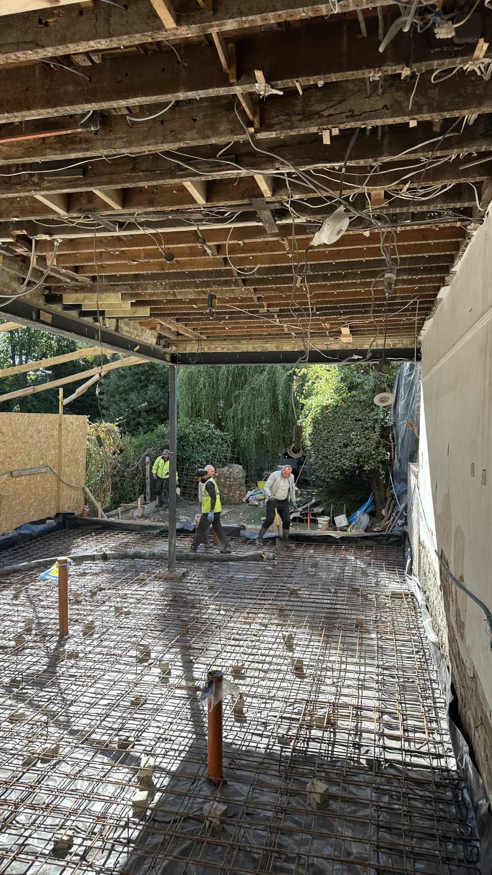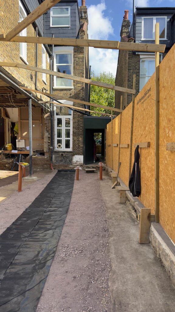 We began by carefully demolishing the existing ground floor structure down to the proposed finished floor level. The area was cleared, levelled and prepared for the new extension. We also removed the external ground and planter, relocated planting where possible, and prepared the garden for a new outdoor platform. Temporary propping was installed to support the upper floor while structural changes were carried out.