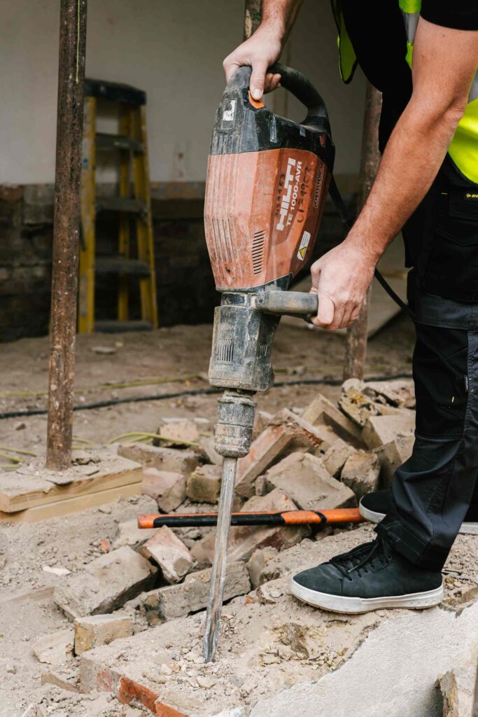 Inside the property, selected timber floor sections were removed and prepared for new construction. The existing fireplace and hearth were demolished, while the chimney above was retained and stabilised. We isolated existing kitchen services, adjusted drainage routes, and prepared the ground floor for underfloor heating and new timber flooring.