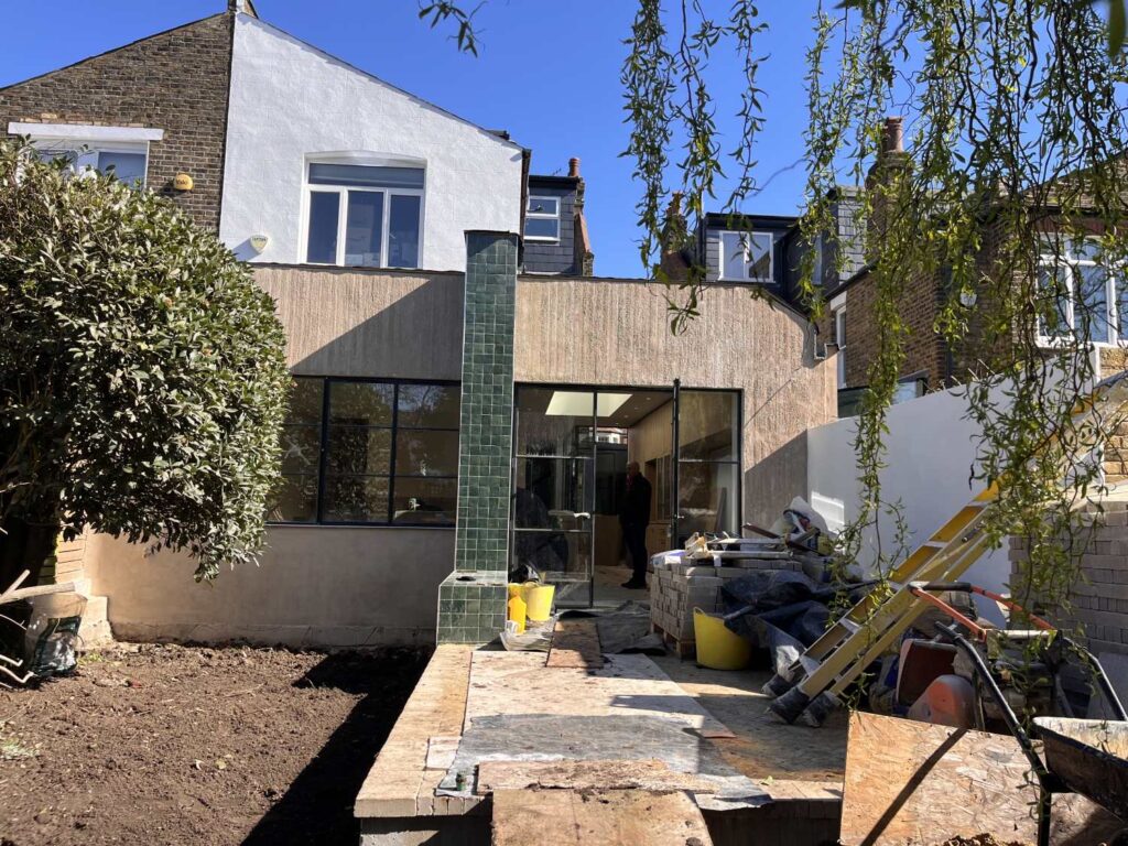 The new rear extension is now taking shape. We constructed thick masonry walls, including an insulated cavity wall and a single-skin insulated wall to the neighbour’s side. Steel-framed French doors with fixed side lights and three equal bi-fold steel windows have been installed, bringing natural light deep into the space. A low masonry wall forms built-in bench seating and helps define the layout.