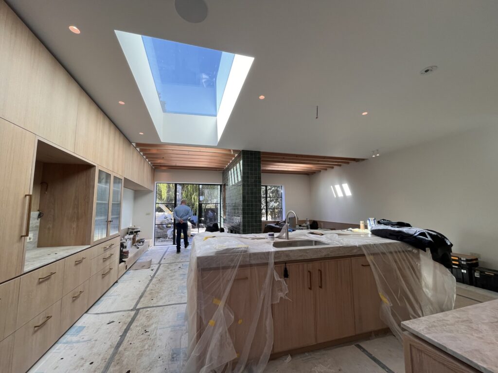 Internally, the ground floor includes polished concrete screed with insulation below. In the reception area, we reused the existing floor framing where possible, corrected joist levels, and installed underfloor heating with engineered timber strip flooring above. A fixed flat roof skylight with a thermally broken aluminium frame brings additional daylight into the kitchen.